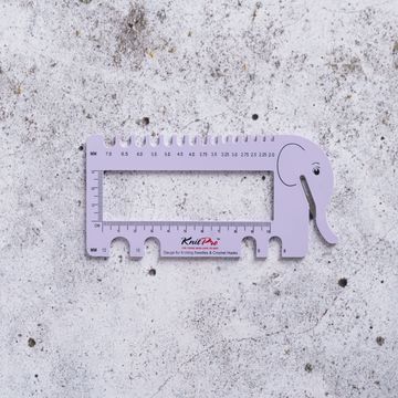 Praktiskt stickmått i form av en elefant! Mäter stickstorlek (2–12 mm), masktäthet och har en diskret garnskärare gömd under snabeln. Ett måste för både stickare och virkare.