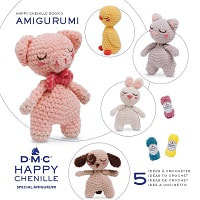 En fin liten mönsterbok med virkdiagram, för att göra 5 olika amigurumi gulliga smådjur i Happy Chenille.