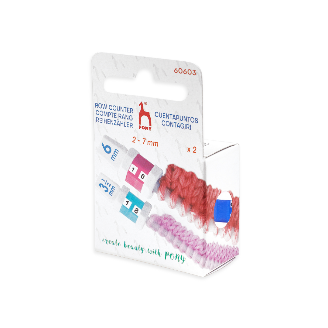 Smidiga varvräknare i klassisk design från Pony. Du trär dem direkt på stickan för att enkelt hålla koll på antal varv eller ökningar/minskningar. Passar stickor i storlekarna 2 till 7 mm. Förpackningen innehåller 2 st.