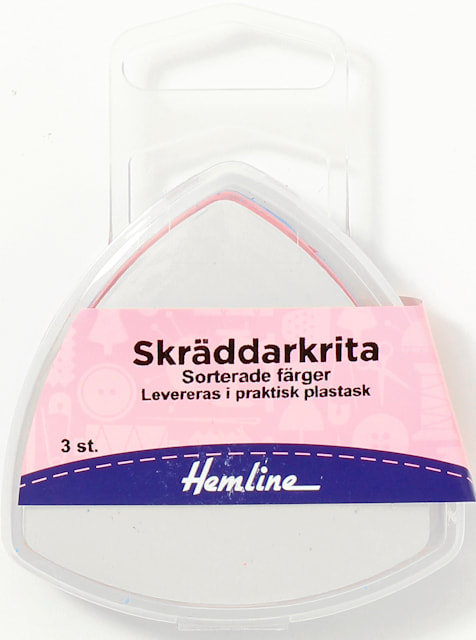 Tre stycken skräddarkritor för tydlig märkning av tyg i sorterade färger, vit, blå och röd, levereras i praktisk plastask. Borstas enkelt bort efter användning.
